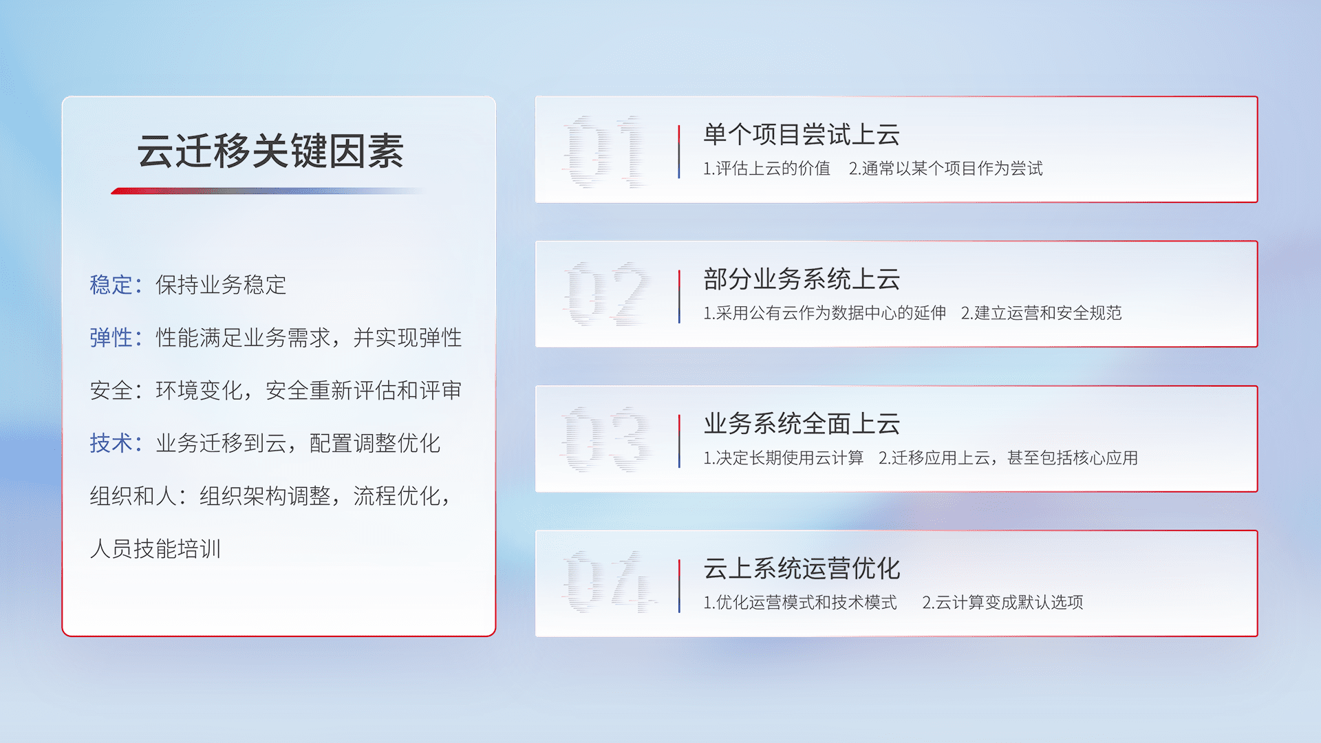 结合实际业务,,,,从规划设计、、、云平台选型、、、云原生改造、、、数据迁移、、集成交付,,,,迁移全过程为客户识别最佳上云路径,,做好风险识别管理,,设计网络架构、、、身份权限、、、安全审计合规、、操作审计、、、日志审计、、监控告警策略、、多站点容灾设计等,,对云上基础设施进行整体规划,,提升IT治理水平,,,以满足弹性、、、、高可用、、高性能的需求。。。